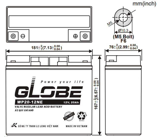 BÌNH ẮC QUY XE MÁY ĐIỆN GLOBE 12V-20Ah (WP20-12NE)