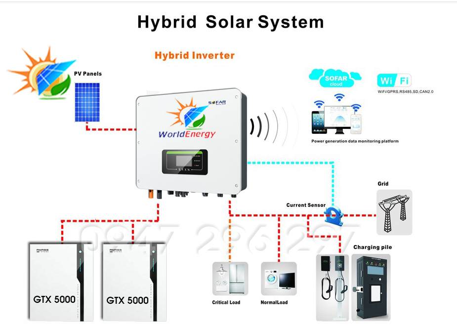 - Điện thu được từ tấm pin mặt trời (Solar Panel) là điện 1 chiều, qua bộ Hybrid Inverter có chức năng đổi từ điện DC – AC cùng pha cùng tần số với điện lưới, sau đó hệ thống sẽ hòa chung or độc lập với điện lưới