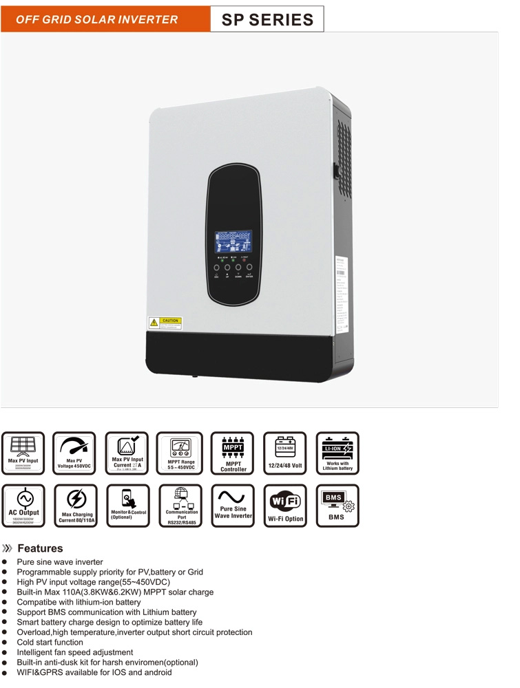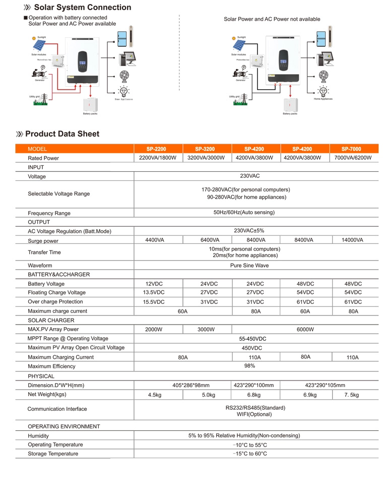 - Dải điện áp đầu vào PV cao: 55-450VDC giúp tối ưu hóa tuổi thọ pin năng lượng mặt trời được cung cấp trực tiếp cho tải trước